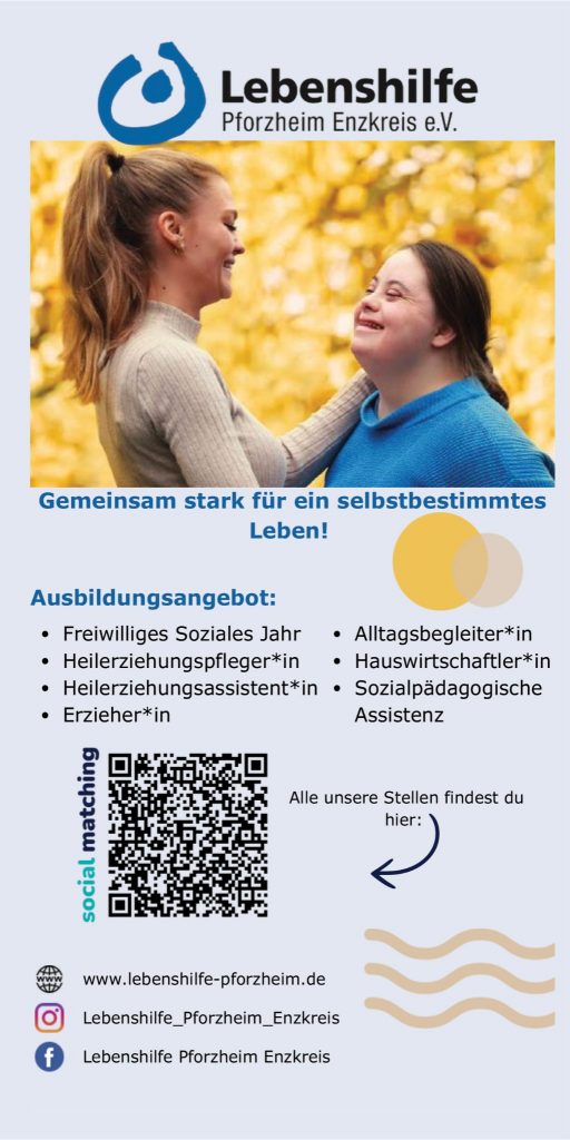 Seit über 60 Jahren ist die Lebenshilfe Pforzheim Enzkreis e. V. als gemeinnütziger Verein tätig. Unser Ziel ist die wirksame Lebenshilfe für Menschen mit geistiger und mehrfacher Behinderung sowie ihrer Angehörigen.